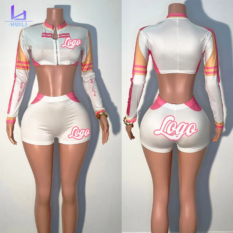 Huili Manufacturer High Stretch Sports Two Piece Sets White Long Sleeve Crop Top Shorts Custom logo Activewear Gym Clothes Women